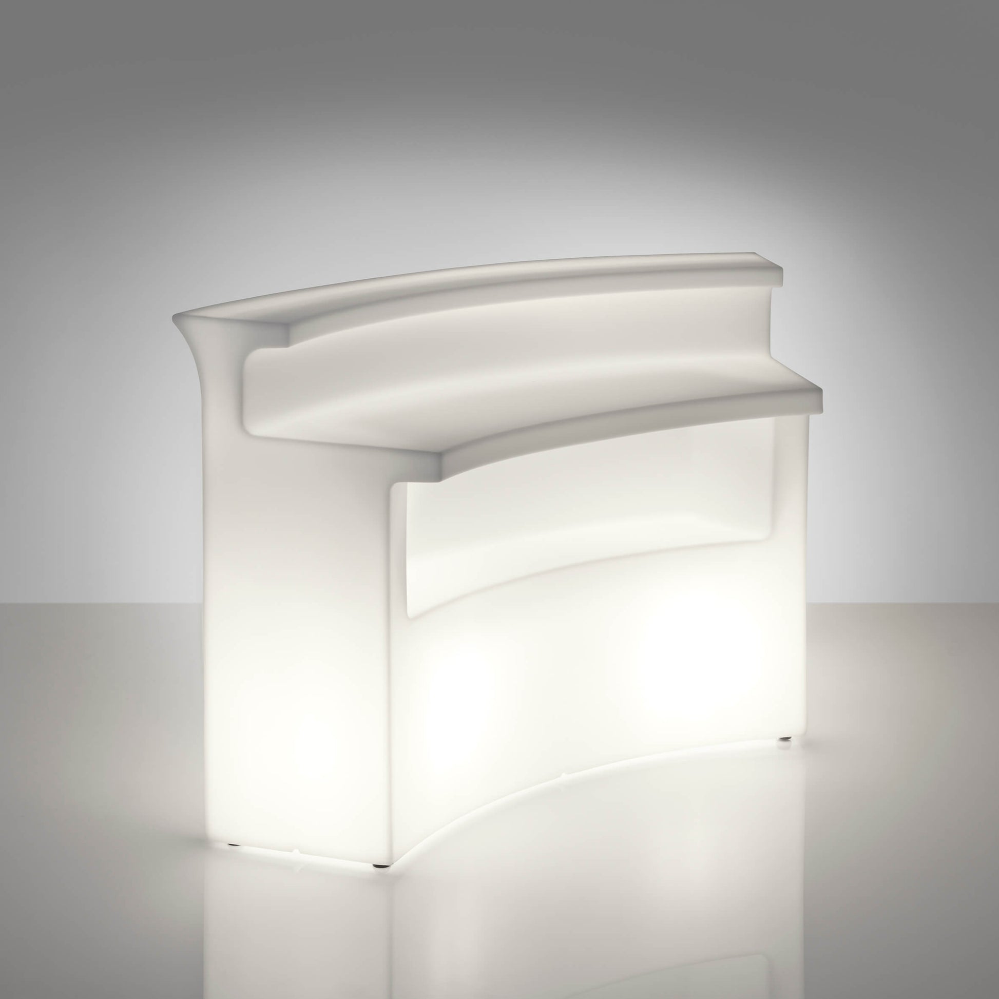 Break Bar is a luminous bar counter, a modern display system, modular and versatile. It is ideal to use as bar counter or reception desk. Thanks to its dimension, Break bar is a useful and complete bar counter that lights up all kinds of spaces, including small areas. It perfectly matches with the other luminous display designed by Slide, as Break Line, Break Corner and Ice Bar. This luminous modular bar counter is ideal for contract and events, for an essential and elegant design. Break Bar is available in lighting white, and it could be customized with logos or images, ensuring a unique, easily identified product.