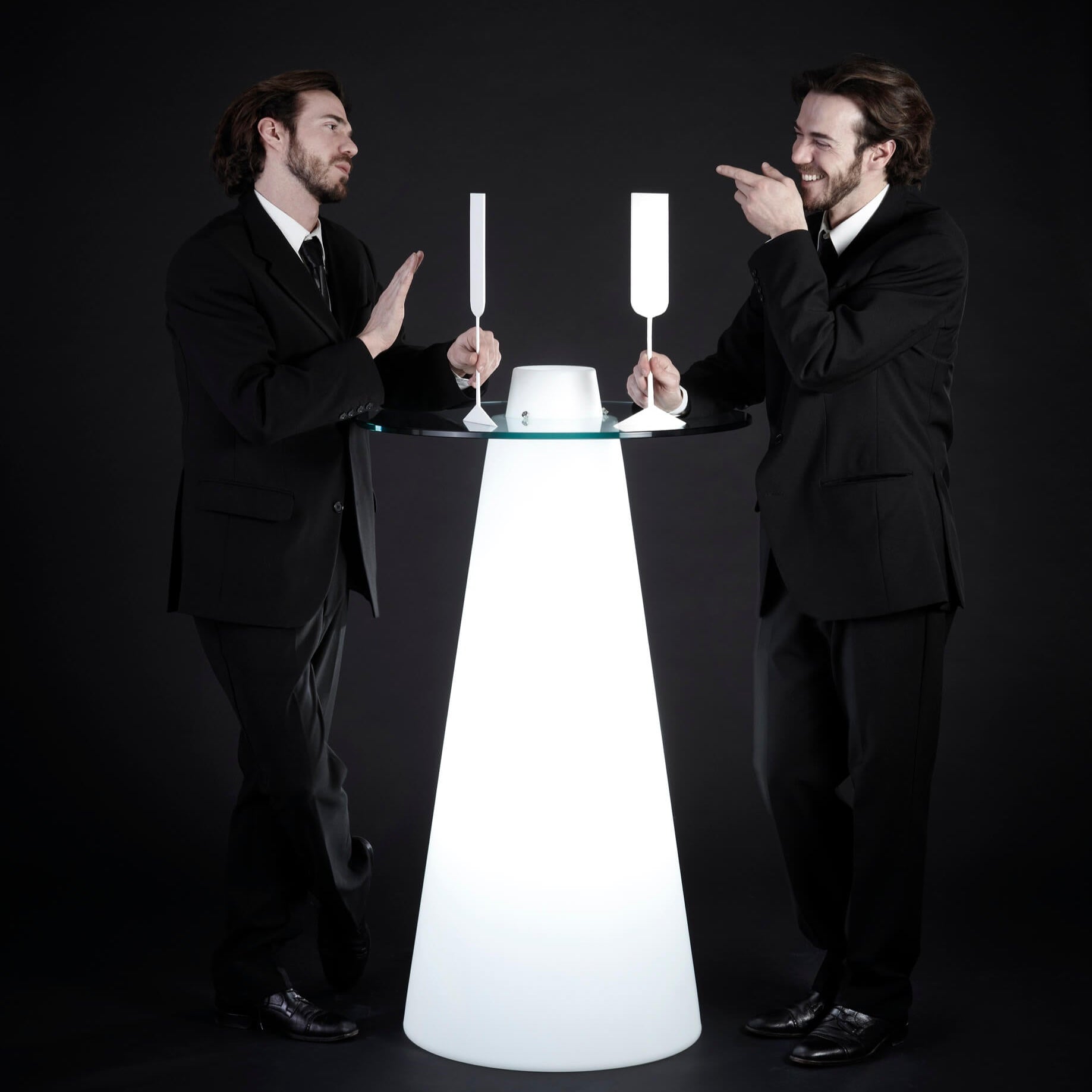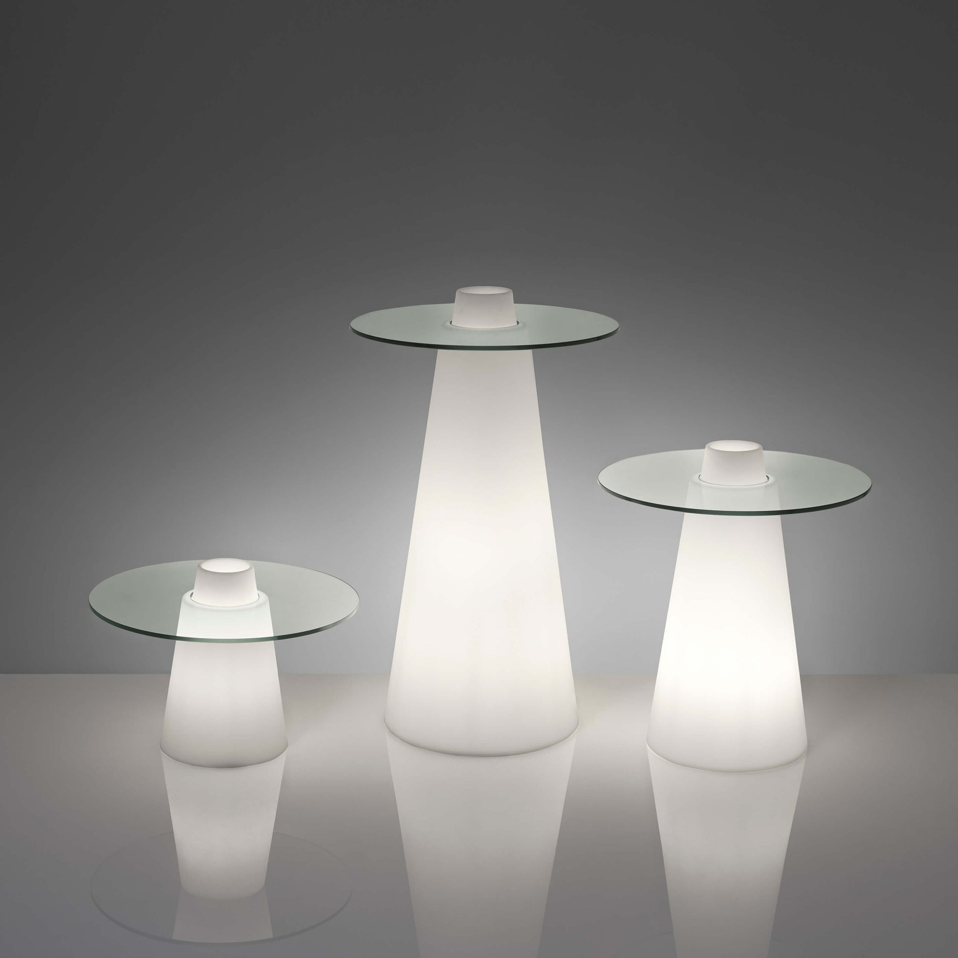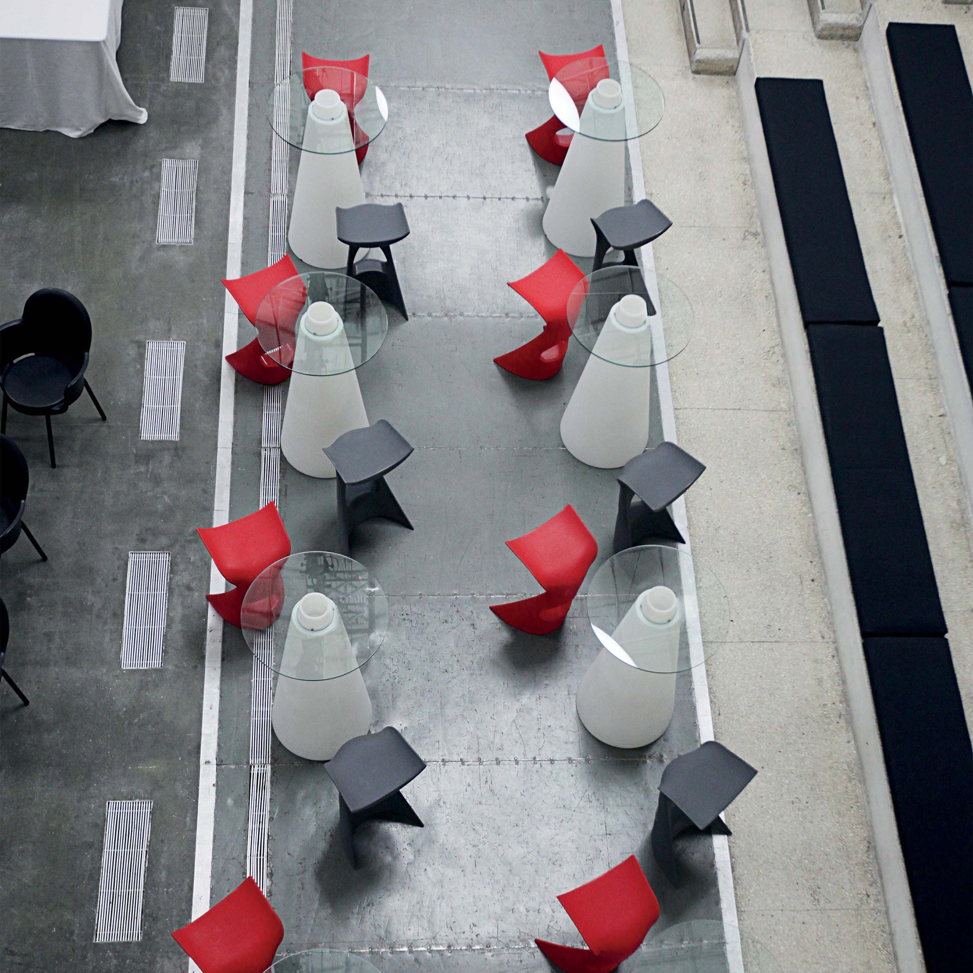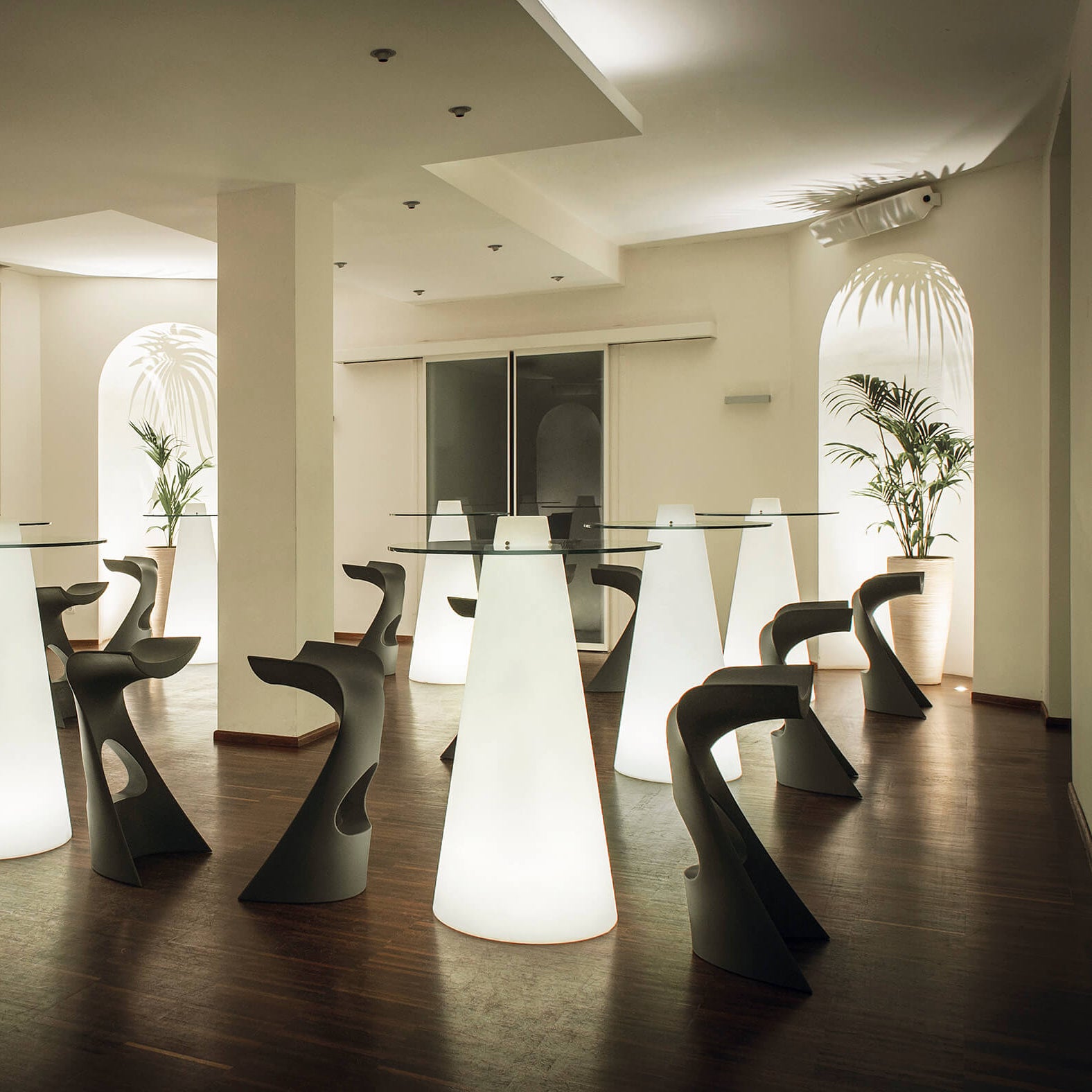 Peak is an eccentric high table, available in standard or in luminous version and designed by Aksu & Suardi Studio. Peak has got an extremely linear design: its base has got a conical shape made in polyethylene, with a round top in tempered glass in different dimensions. The main feature of Peak is the central bottle rack, ideal to special occasion. Peak is available in luminous version and in all standard and lacquered colours.