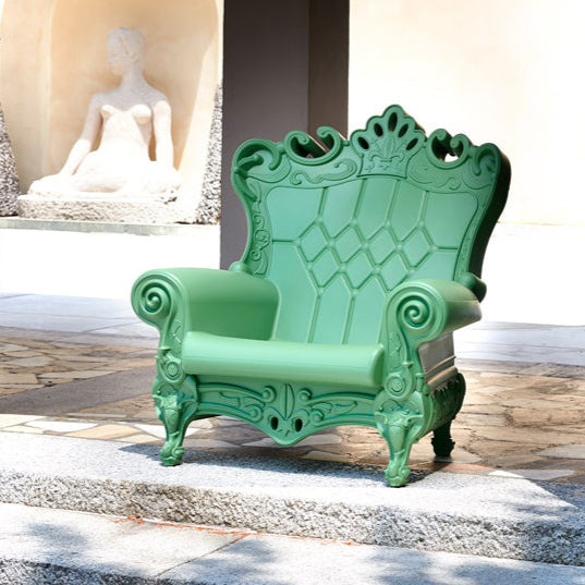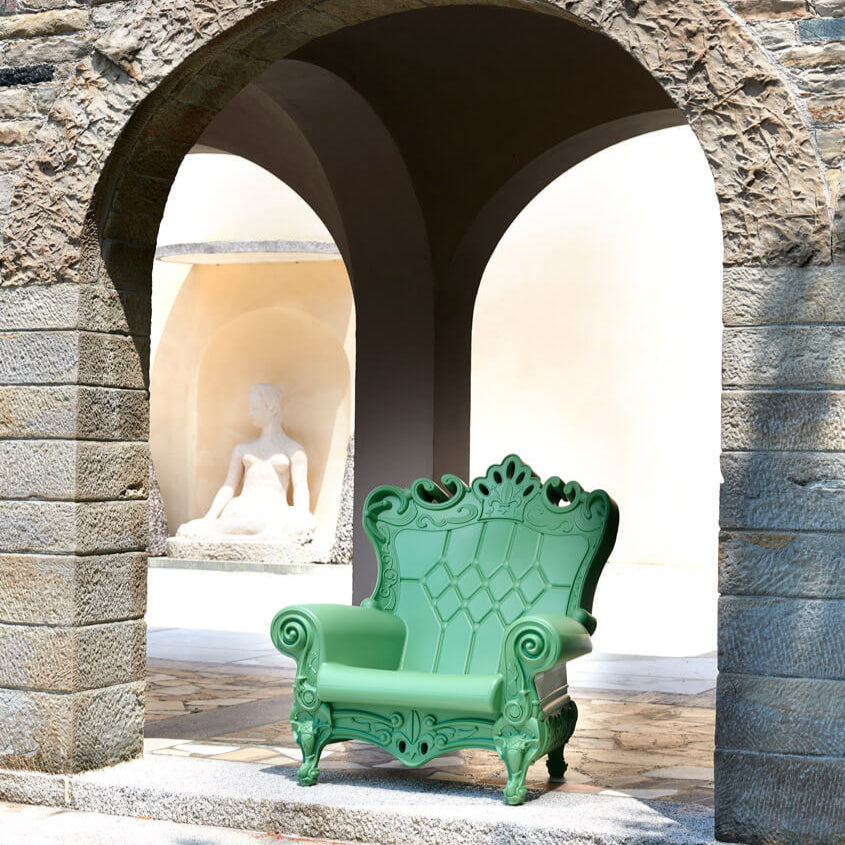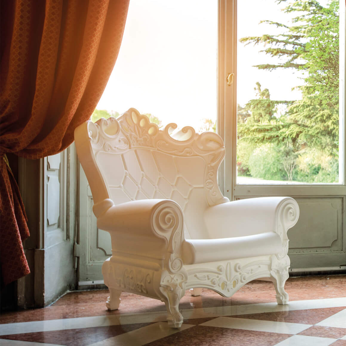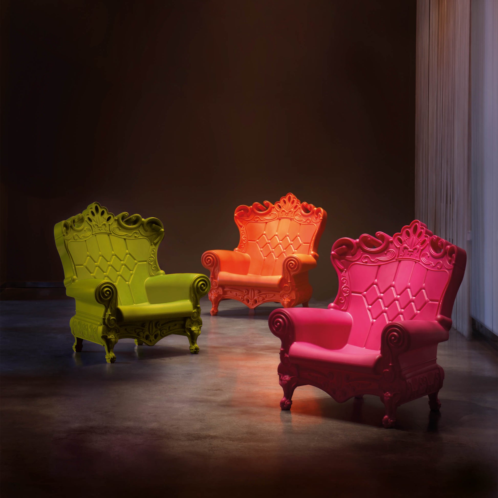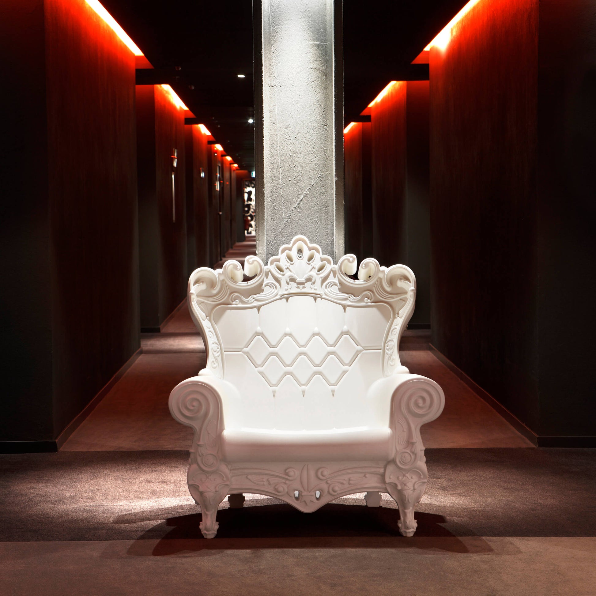 Queen of Love is the unique armchair created by the designer Graziano Moro and Renato Pigatti. The iconic Queen of Love armchair is the first and the most loved product of the whole Design of Love collection: as a throne, Queen of Love crowns everyone who sitting on it. Queen of Love is full in details, as typical baroque style, but it is contemporary, pop and ironic thanks to the material in which it is made, polyethylene. Queen of Love is elegant, attractive, pop and unforgettable, for this reason it is often the protagonist of tv shows and international events.